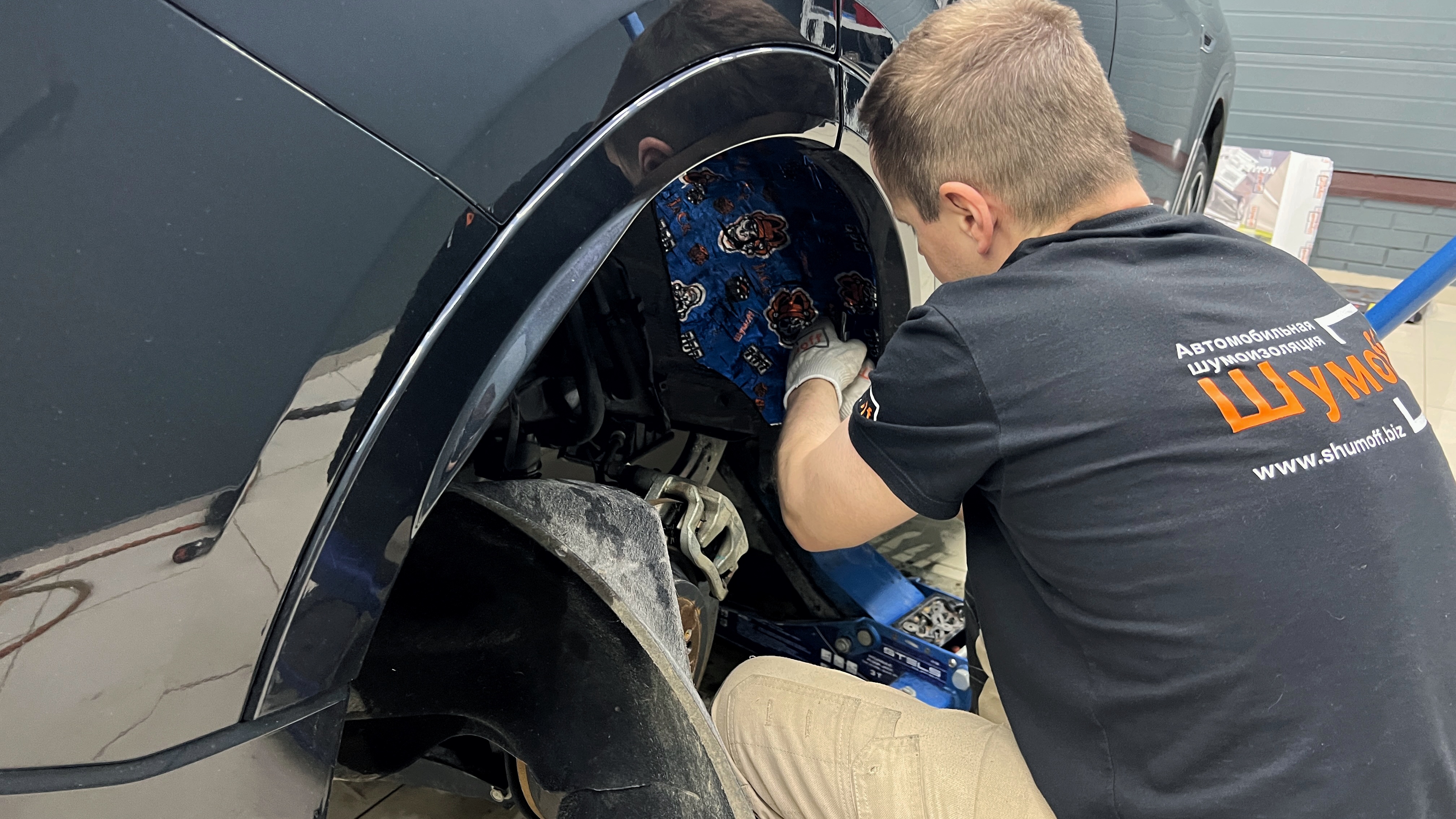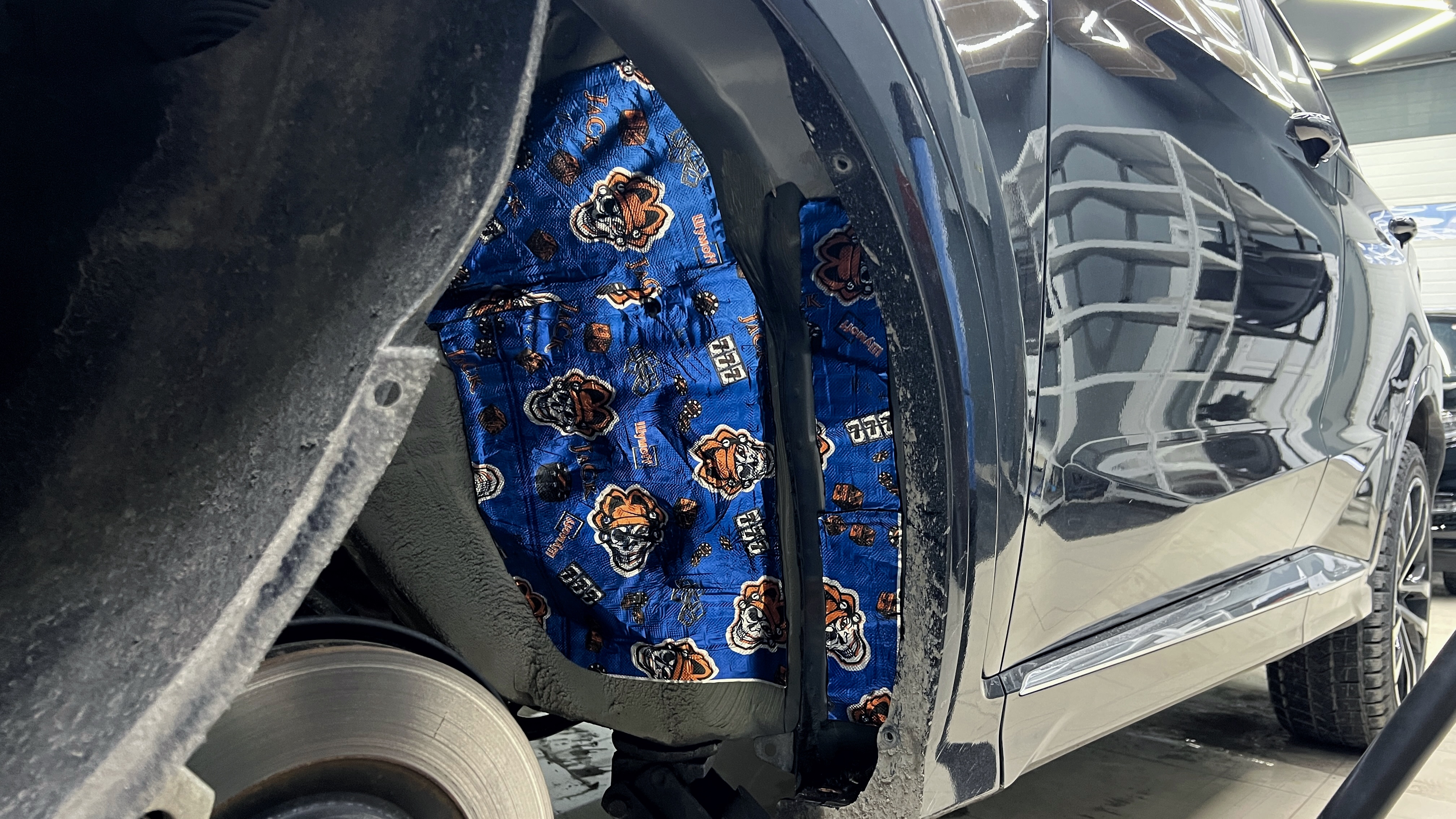 Жидкая резина Джетур X70 Далее всю оклеенную виброизоляцию покрываем жидкой резиной. Данный слой носит не только эстетический эффект, но и служит отличной защитой. Третьим слоем на подкрылки монтируем виброизоляцию Шумофф Jack. Данный слой отлично устраняет эффект барабана, ведь арки постоянно подвержены воздействиям различных внешних сил, таких как: вода, песок, камни и т.д . Все это, отлетая, создает ощутимые шумы, ведь каждый удар камня создает достаточно шумный резонанс, передающийся в салон. Завершаем шумоизоляцию арок обратной сборкой, устанавливаем подкрылки и колеса на место.