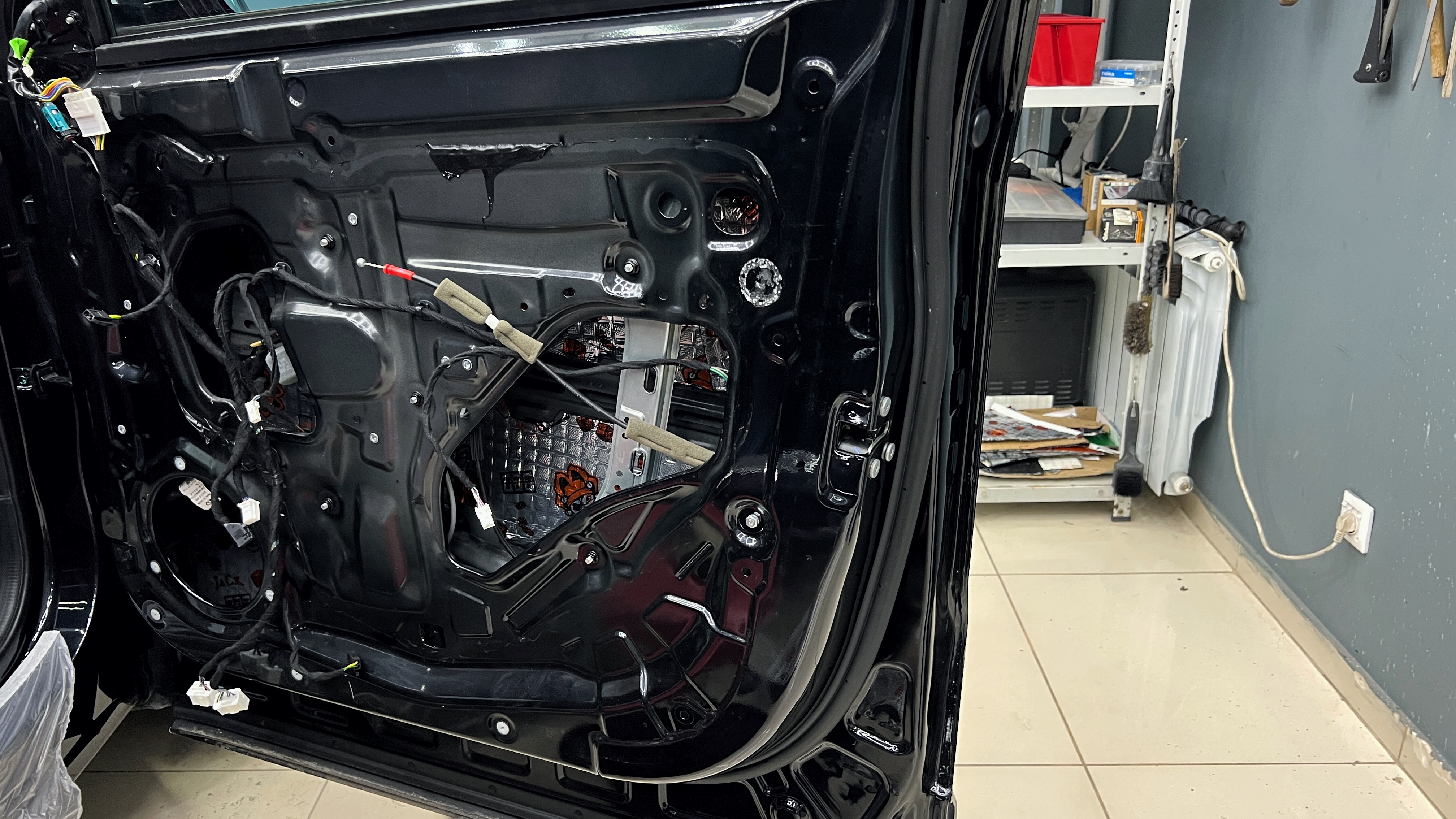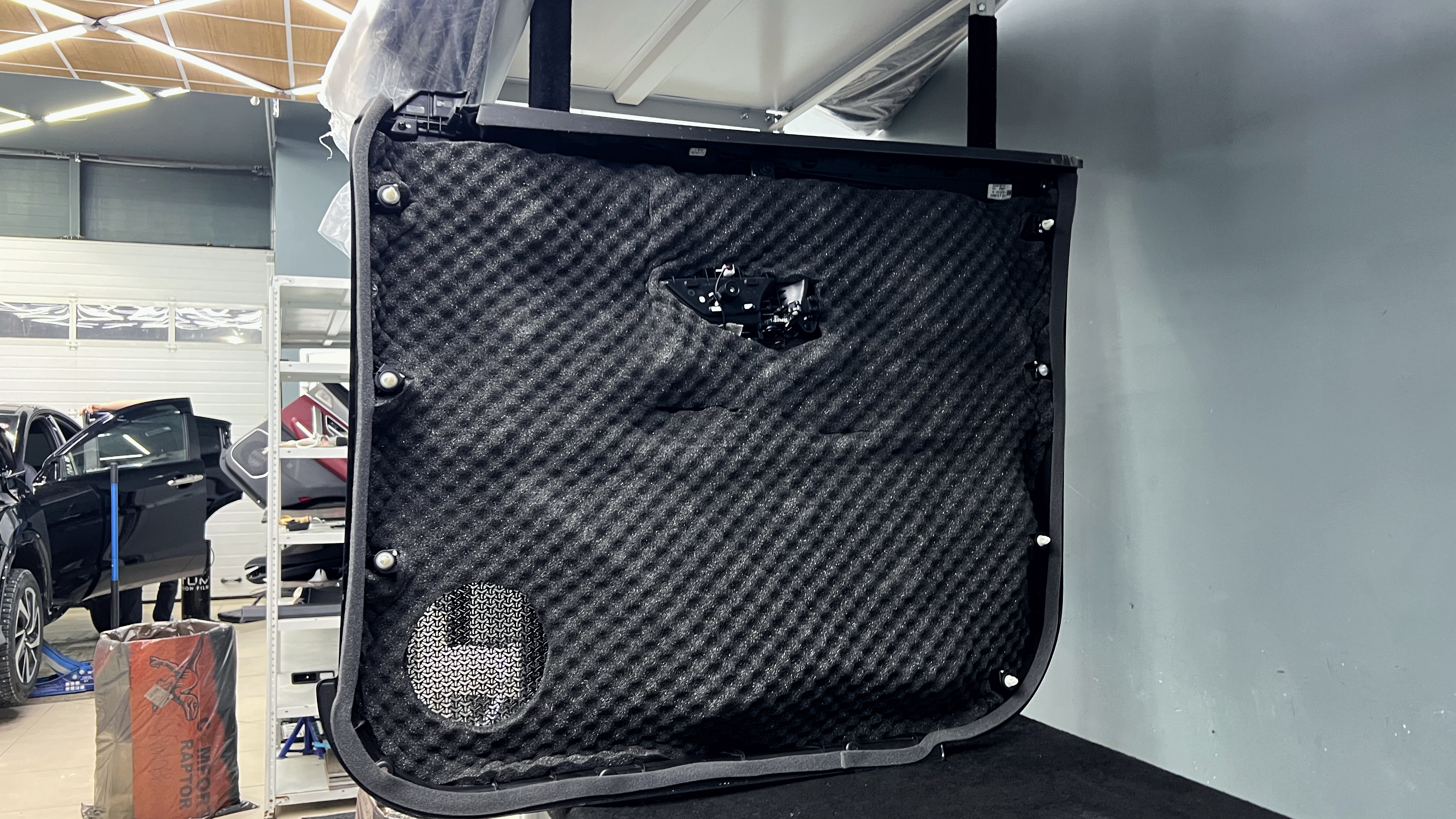 Разбор дверей Джетур X70 Снимаем дверную обшивку и убираем ее на специальный стеллаж для всего салона. Удаляем влагозащитную пленку с двери и приступаем к обезжириванию всех поверхностей двери перед нанесением материалов.