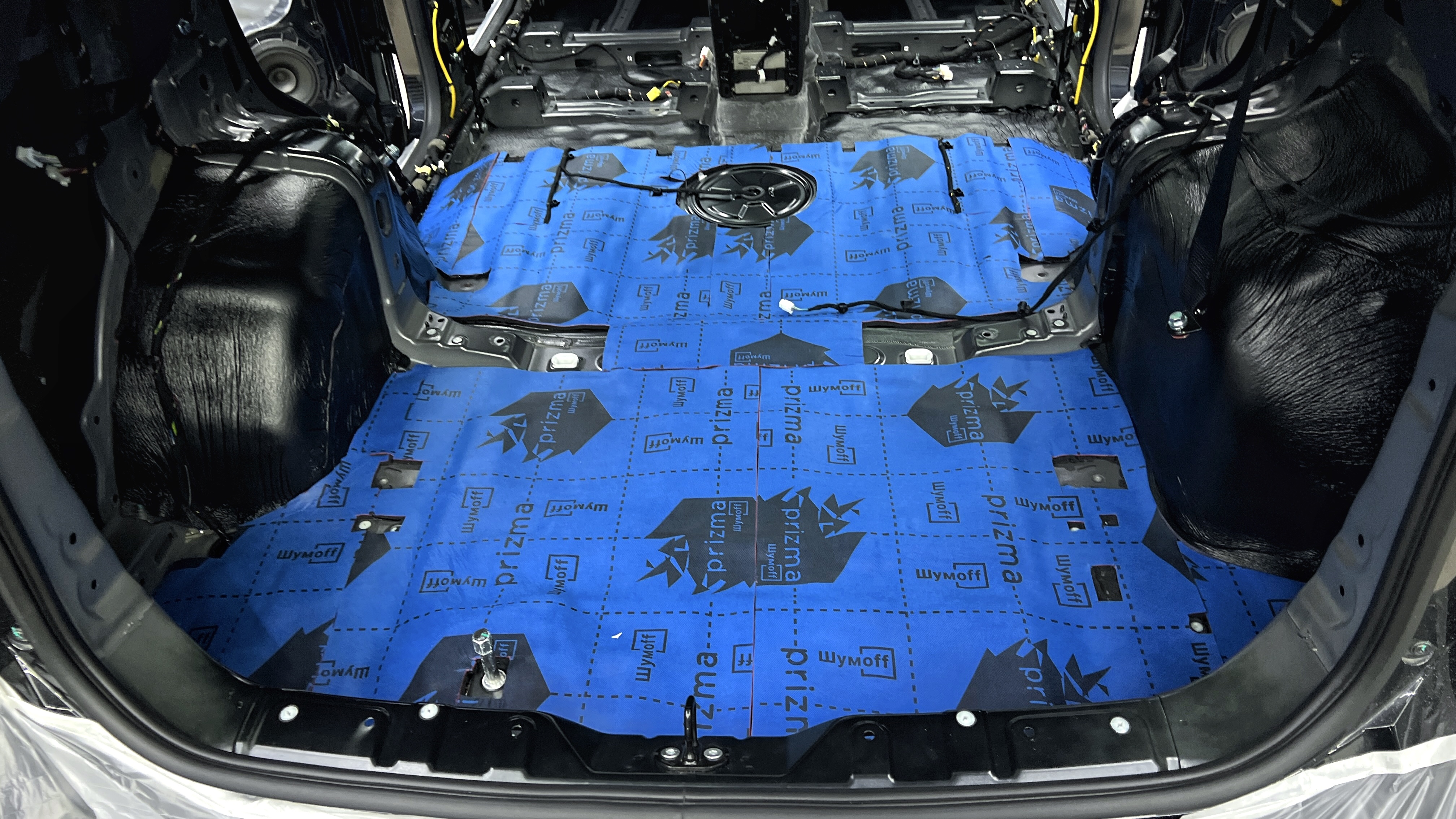 Шумоизоляция багажника Джетур X70 Далее все дно оклеиваем шумопоглотителем Шумофф Prizma 6. На крылья вторым слоем клеим более толстый рельефный шумопоглотитель Absorber А15.