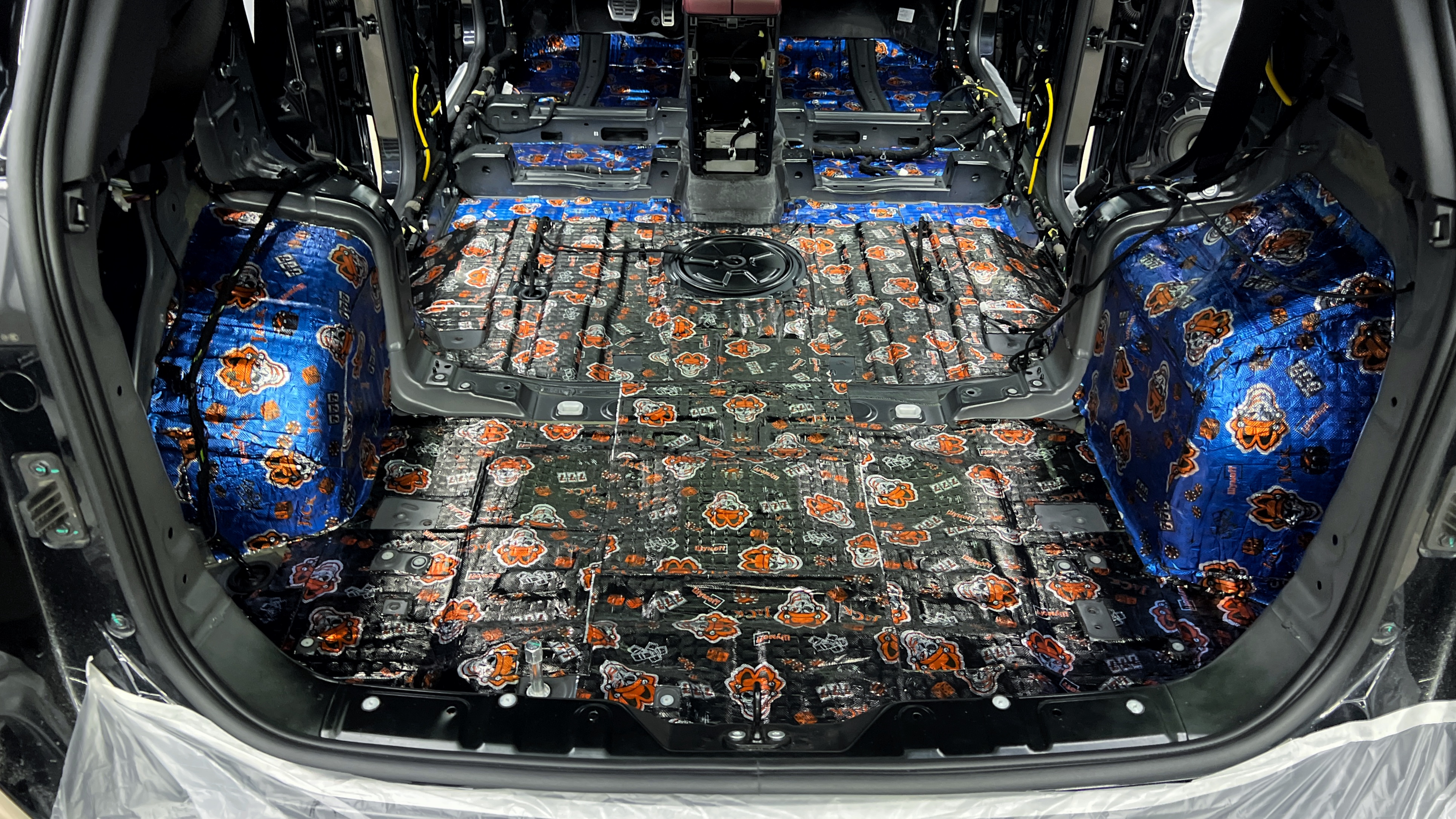 Максимально вверх к моторной перегородке, весь пол и под задним сиденьем оклеиваем