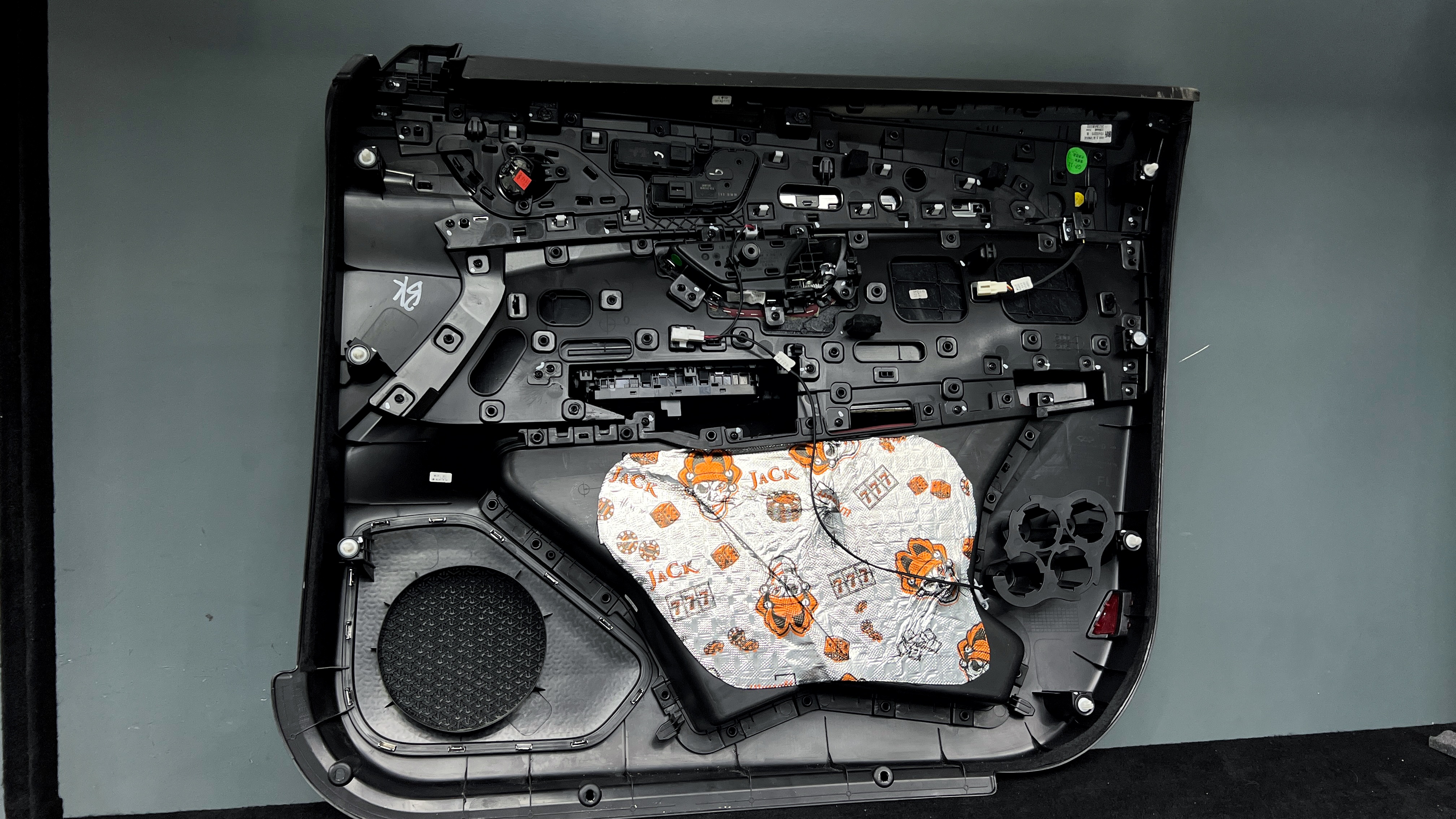 Переходим к оклейке самого корпуса панели, первым слоем частично наносим виброизоляцию Шумофф Joker, создавая тем самым идеальный баланс. Такая частичная оклейка позволит нам чрезмерно не утяжелять панель и придать ей необходимую сбитость